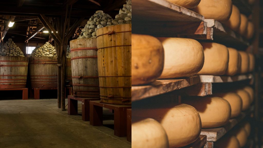 Miso aging is a slow, uniform internal process driven by koji enzymes. Cheese aging often occurs from the outside inward, influenced by rind microbes and cave environments. In other words: miso ages “through decomposition,” while cheese ages “through transformation of acidity, moisture, and surface ecology.” These contrasting philosophies shape everything from texture to aroma intensity.